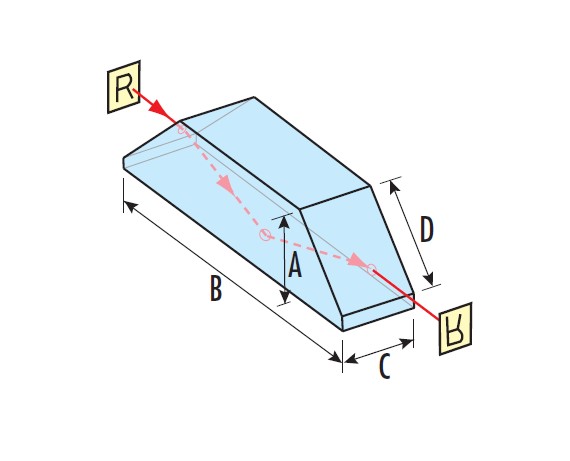 道威棱鏡 它有兩種應用,主要用途是用作旋轉器,它可以旋轉圖像但不會使光束偏轉,當棱鏡繞輸入平行光線旋轉某個角度時,圖像會旋轉該角度的兩倍,非常重要的是,該應用必須與平行或準直光束一起使用,并且大型方形反射面應保持非常干凈;另一種用途是用作回射器,在這種應用中,它相當于一個直角棱鏡。